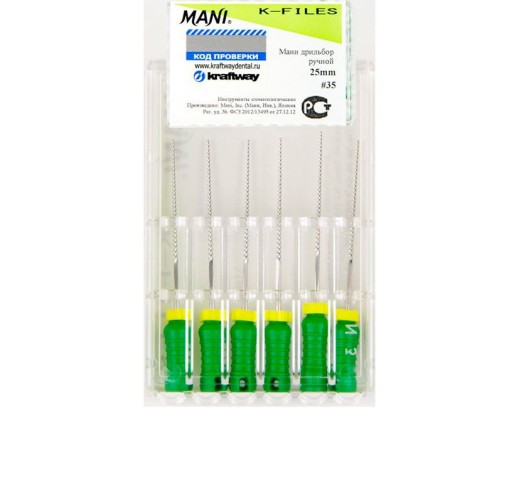 При длине 25 мм К-файлы №35 Mani могут использоваться для работы с сильно искривленными профилями. Рабочая часть изготовлена из специально подготовленной нержавеющей стали, а удобная ручка – из прочного пластика.