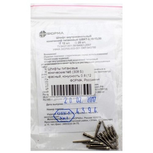 Титановые штифты № 6 308S от Форма – внутриканальный, высококачественный продукт, применяемый в процессе терапевтического и ортопедического лечения врачами стоматологами. Изделие используют как прочную и надёжную основу для искусственных конструкций из керамических и металлокерамических материалов.